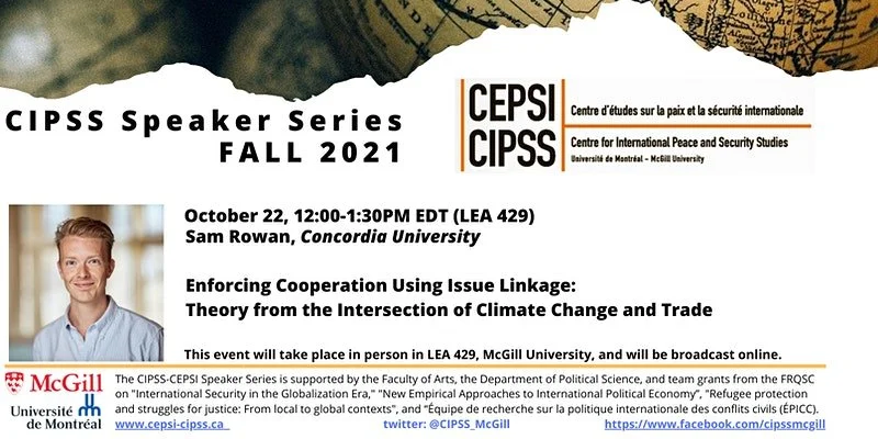 Sam Rowan is an Assistant Professor in the Department of Political Science at Concordia University. His research focuses on international cooperation, institutional design, and climate politics. He holds a doctorate (DPhil) in International Relations from the University of Oxford.